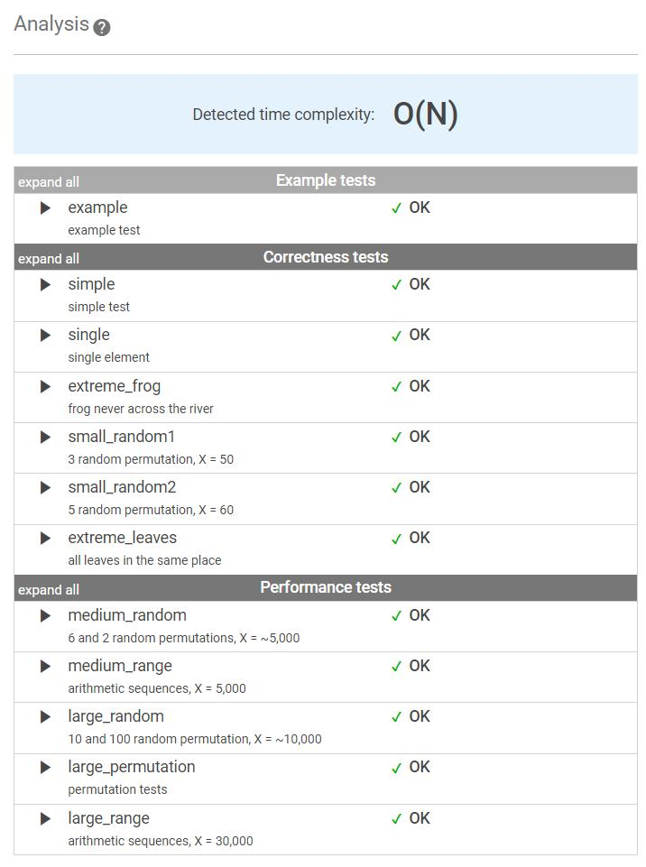 The goal is to find the earliest time when the frog can jump to the other side of the river. The frog can cross only when leaves appear at every position across the river from 1 to X (that is, we want to find the earliest moment when all the positions from 1 to X are covered by leaves). You may assume that the speed of the current in the river is negligibly small, i.e. the leaves do not change their positions once they fall in the river.
