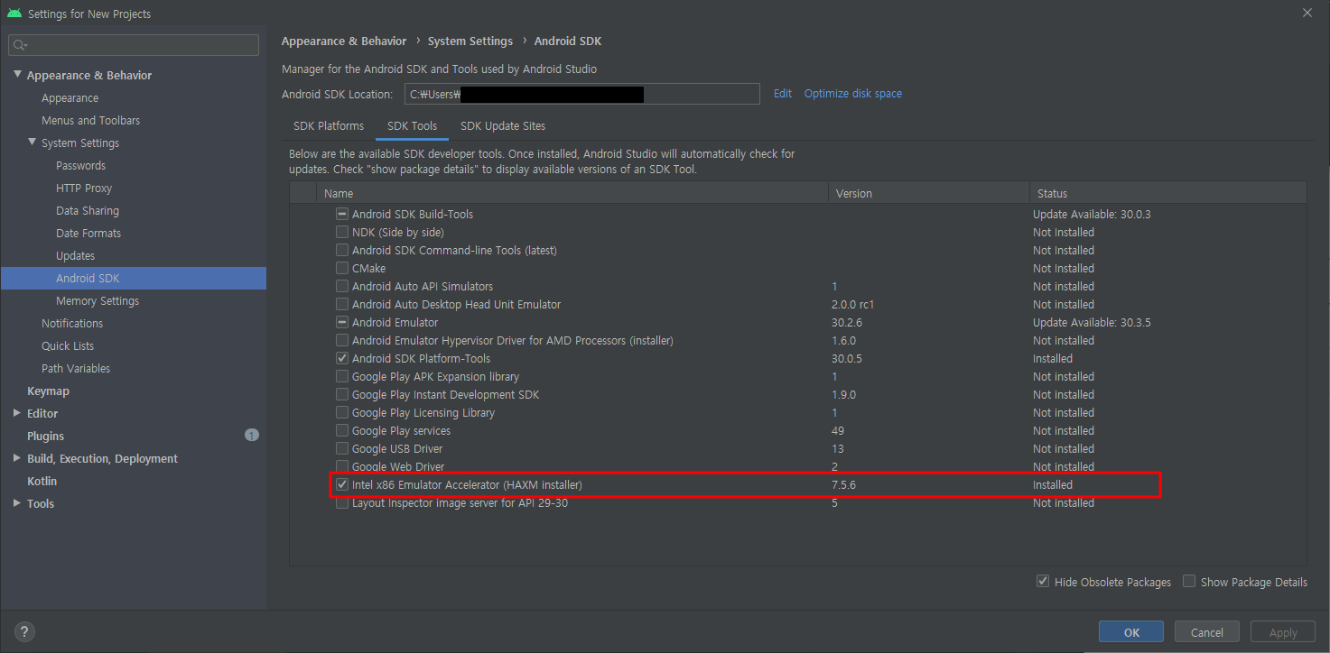 1. SDK Manager > SDK Tools > Intel x86 Emulator Accelerator (HAXM installer) 설치 여부 확인