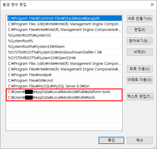 시스템 > 고급 시스템 설정 > 시스템 변수 Path > [설치 위치\Sdk\tools], [설치 위치\Sdk\platform-tools] 추가