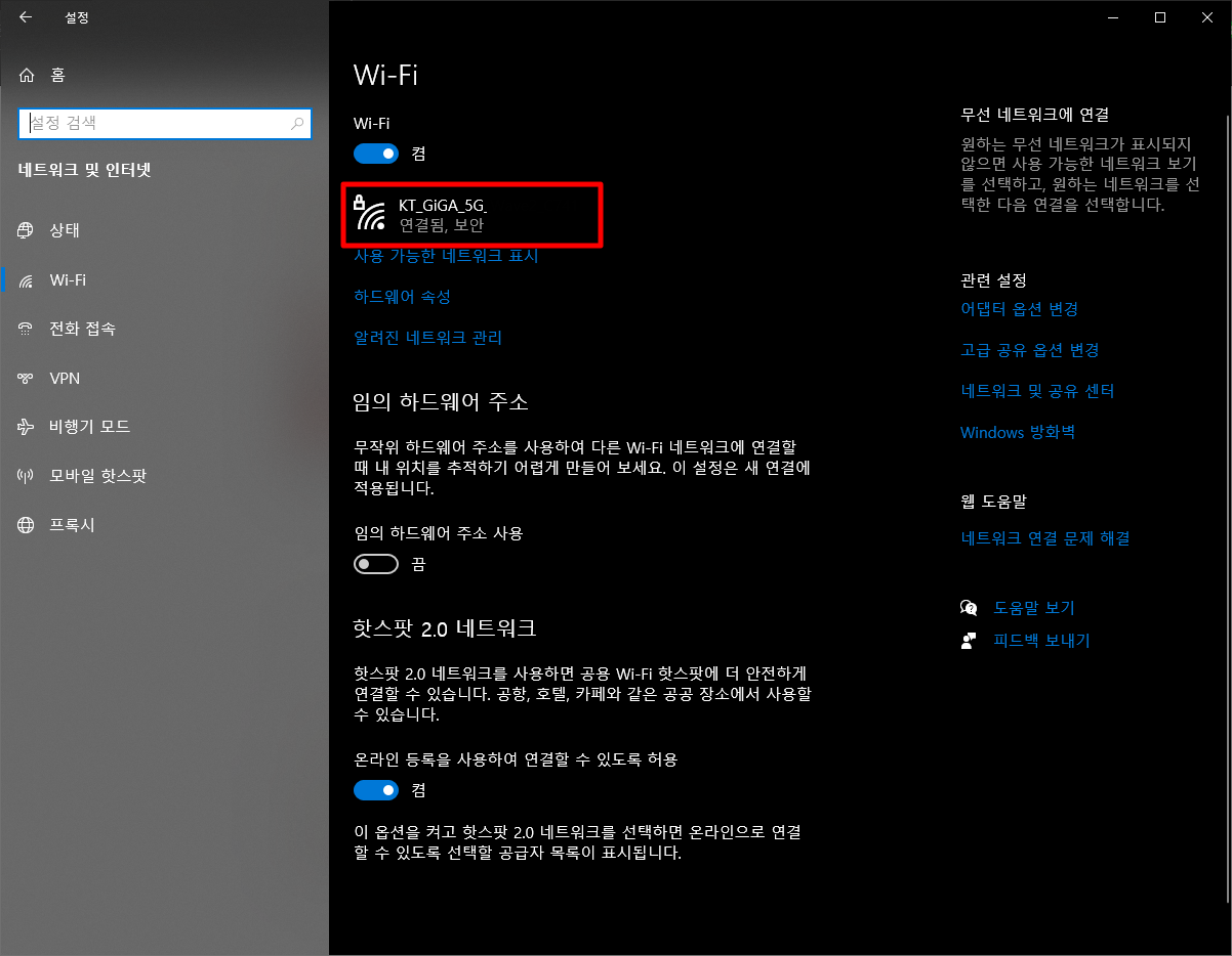 2. [windows10] 설정 > 네트워크 및 인터넷 > Wi-Fi > 연결된 wifi 선택 > 네트워크 프로필 "개인"으로 변경