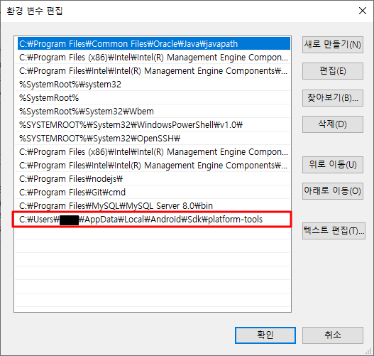 시스템 > 고급 시스템 설정 > 시스템 변수 Path > adb 경로 추가
