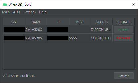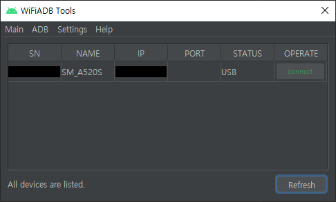 Android Studio에서 Ctrl+Alt+2를 누른 후 실행되는 WiFiADB Tools창에서 핸드폰을 USB로 연결하고 Refresh 버튼 클릭 > connect 버튼 클릭