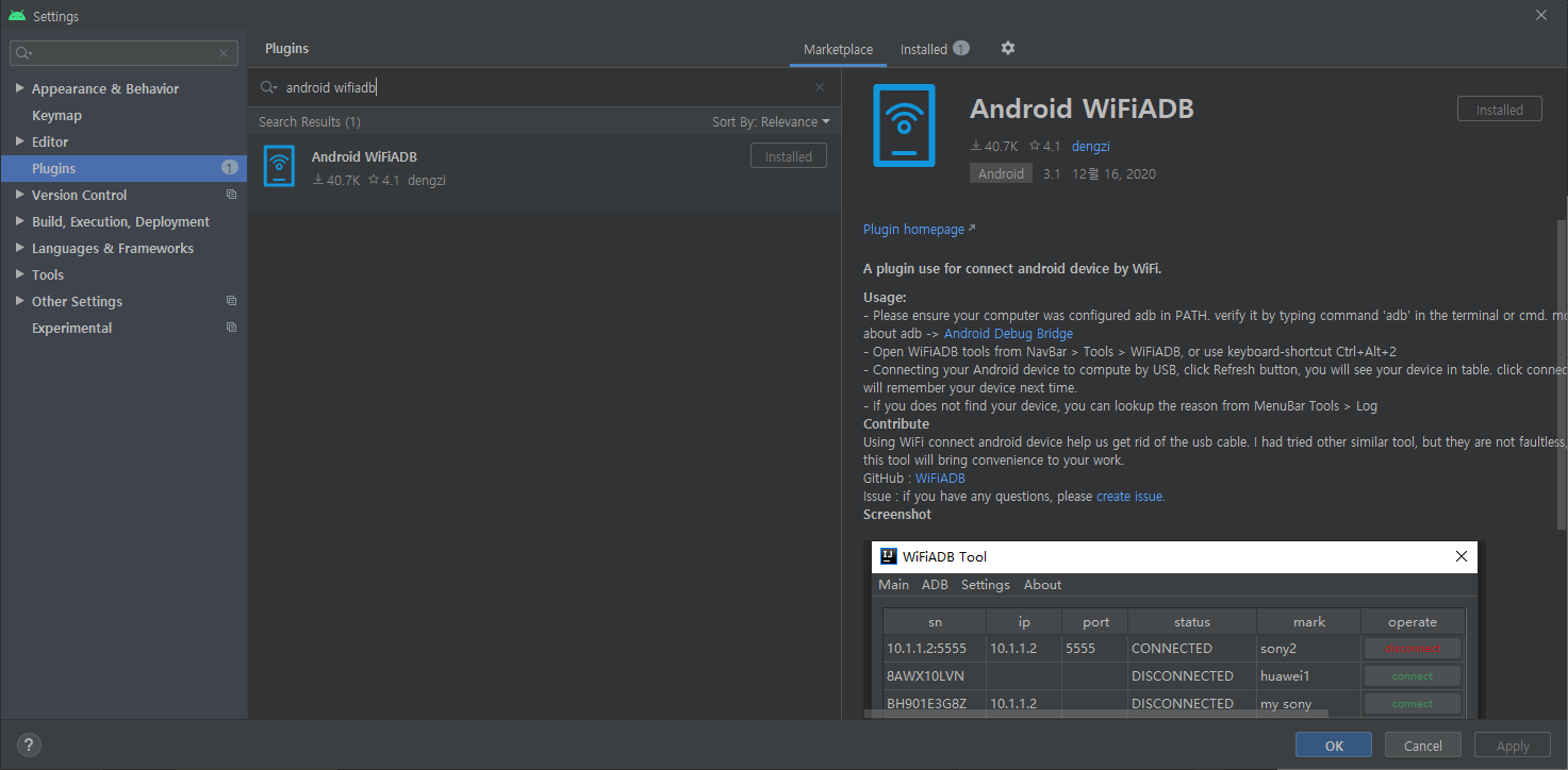 Android Studio에서 Settings > Plugins > Marketplace > [Android WiFiADB] 검색 후 Install